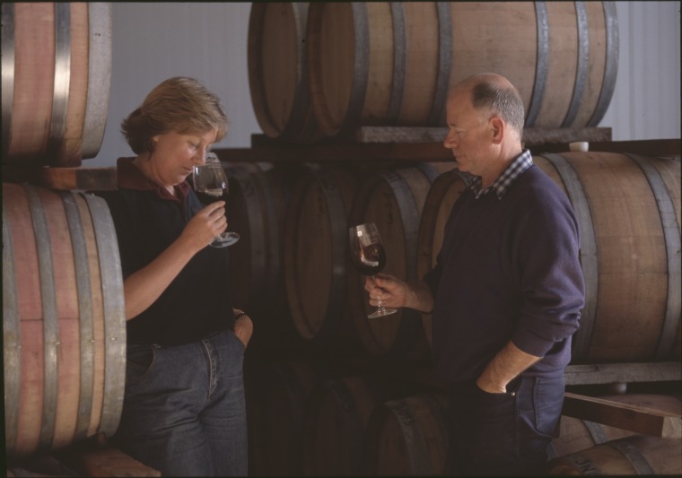146745PD: : Shelley Coad samples wine with John Wade, winemaker in the cellar of Jingalla Wines, Porongurup, 1994?