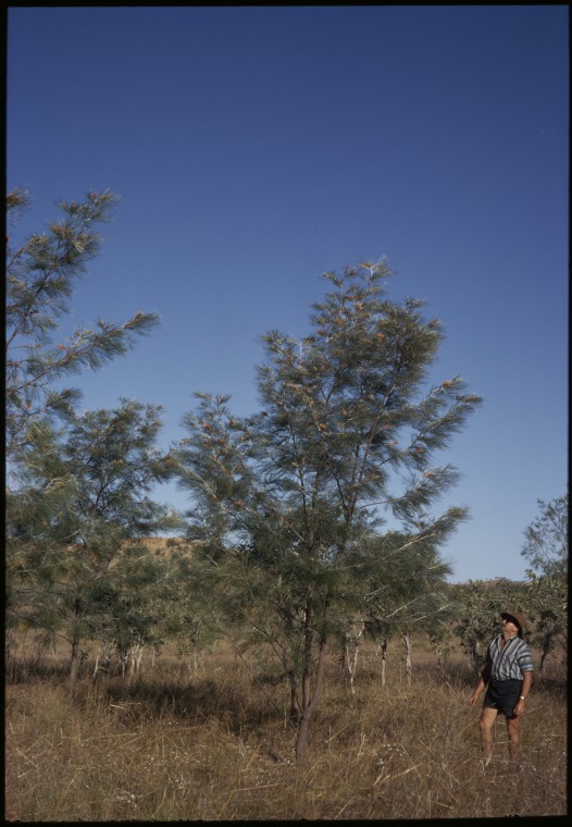 148363PD: Herbert Demarz with Grevillea pteridifolia, East Kimberley pindan near Kununurra, Western Australia, August 1968.