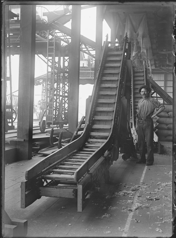 153996PD: Wheat handling operations at the North Wharf grain sheds, Fremantle Harbour, 1911?