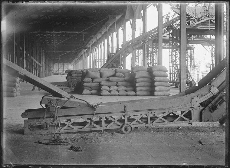 153997PD: Wheat handling operations at the North Wharf grain sheds, Fremantle Harbour, 1911?