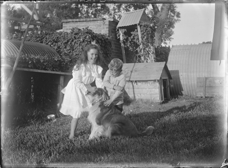 154064PD: Hughie (Frank Hubert) and Marjory (Edith Olive Marjory) Stevens with Buster, 6 March 1910