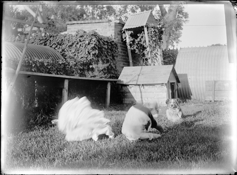 154065PD: Hughie (Frank Hubert) and Marjory (Edith Olive Marjory) Stevens with Buster, 6 March 1910