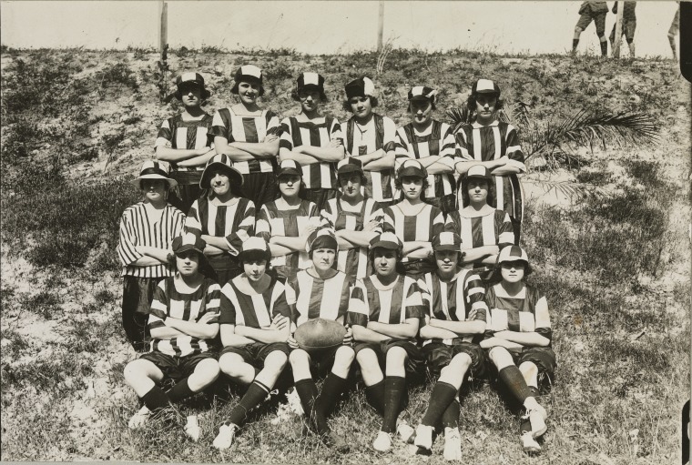 BA2743/6: Group portrait of Mayland-Norwood team at ladies football match against combined team from Boans and Foy and Gibson, 1921.