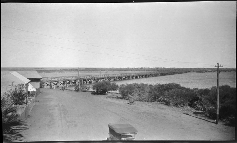 112962PD: Carnarvon tramway bridge, possibly between Olivia Terrace and Whitlock Island, ca. 1920.