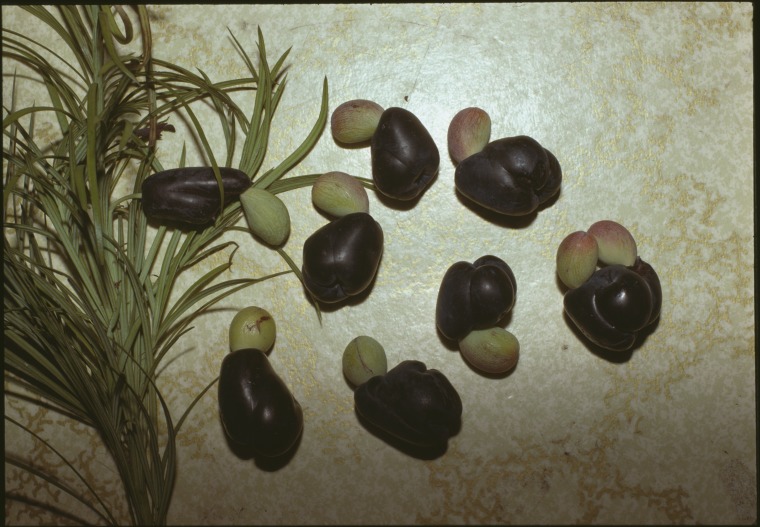 143704PD: Emu bush, Podocarpus drouyniana. Fruit is edible and palatable. Denmark, May 1986.