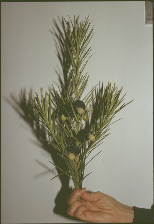 143705PD: Emu bush, Podocarpus drouyniana. Fruit is edible and palatable. Denmark, May 1986.