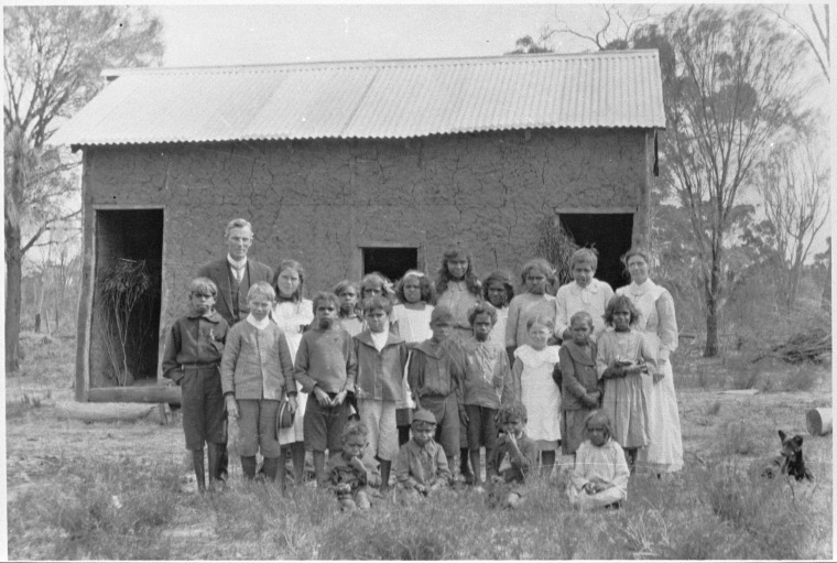 067050PD: Ethel and William Fryer with school children at Carrolup Native Settlement, 1916