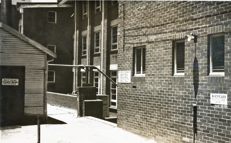 BA2787/4: L to R: Standby generator hut, Mechanical Engineering Laboratory and toilets. "The West Australian" printing press building in background.