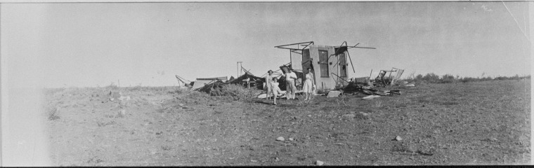 023957PD: L-R: Betty House, Trish Leslie, George Moseley,Dorrie Leslie with the ruins of the shearers kitchen and mess after the cyclone of 6 March 1945