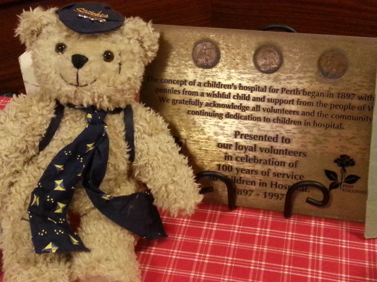 BA2573/123: Stitches the bear and plaque to volunteers.