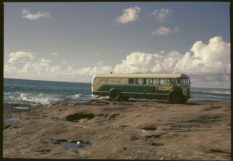 300732PD: Comeng DP41 Westrail Permanent Way Gang bus on the rocks at Red Bluff, Kalbarri, 1966.