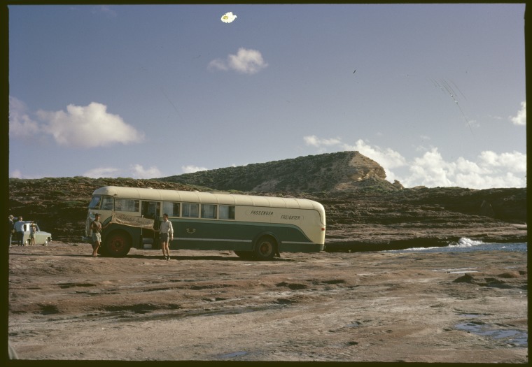 300733PD: Comeng DP41 Westrail Permanent Way Gang bus on the rocks at Red Bluff, Kalbarri, 1966.