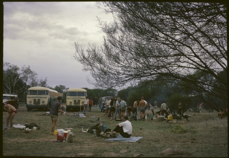 300734PD: Camp by river on Youth Hostels Assocation trip on DP41 Westrail Permanent Way Gang buses, North-West Australia, 1966.