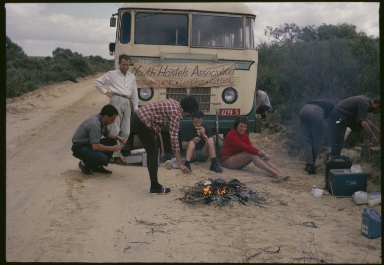 300735PD: Lunching by the side of the road, Youth Hostels Assocation trip on DP41 Westrail Permanent Way Gang buses, North-West Australia, 1966.