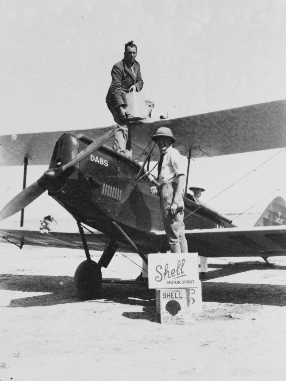 4383B/291: H.F. (Jim) Broadbent (left) and Mr Durack refuel the Avro Avian IVM VH-UQE "Dabs" at Wyndham during his record round Australia flight, 3 September 1931