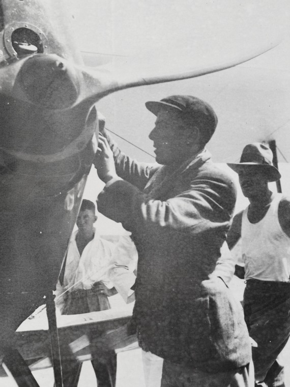4383B/285: H.F. (Jim) Broadbent prepares his Avro Avian IVM VH-UQE "Dabs" at Wyndham during his record round Australia flight, 3 September 1931