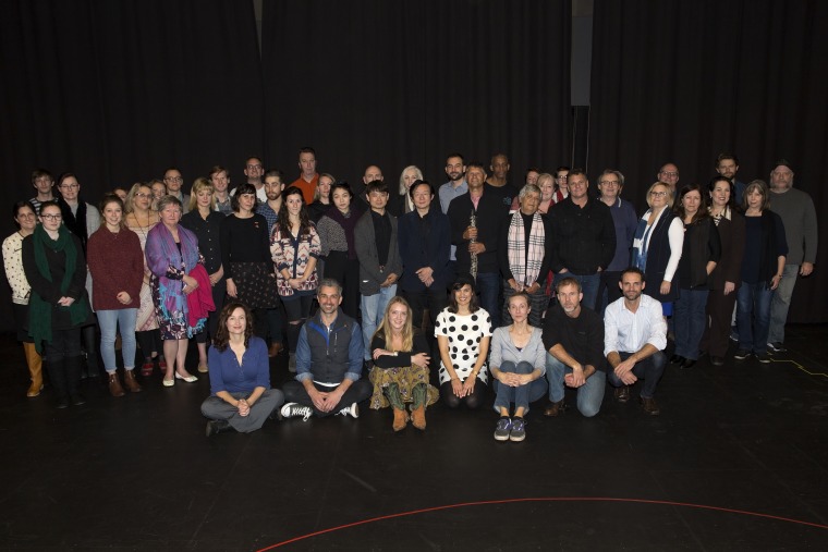 Black Swan STC - Caucasian Chalk Circle - group shot, photographed in rehearsal room #1 at the State Theatre, corner William and Roe Streets, Northbridge. BSSTC’s first international collaboration – with National Theatre of China (Beijing). guest director Wang Xiaoying, vice-president of the National Theatre of China, whose staging of this Chalk Circle as a Chinese parable brings it full circle to the original tale that inspired Brecht. The costumes were designed by Zhao Yan and the masks by Zhang Huaxiang both Beijing based Chinese theatre professionals. Set design was by Australia’s Richard Roberts, and music by Nyoongar composer Clint Bracknell. Black Swan’s 25th anniversary year is the inspiration of exiting artistic director Kate Cherry. The performance ran 30 July - 14 August 2016 at Heath Ledger Theatre (W.A. State Theatre). Photographed 30 June 2016.Front seated (L-R): cast member Caitlin Beresford-Ord, production member Brendan Hanson, female lead “Grusha” Alex Malone, cast member Kylie Farmer, cast member Alison van Reeken, cast member Steve Turner, cast member Stuart Halusz. Middle Row standing: production person Chantelle Iemma, Andrea McIntyre, BSSTC production person Maddy Jolly Fuentes, BSSTC production person Alena Tompkins, BSSTC production person Amanda Luke, cast member Felicity McKay, Jessica Knight, Jeffrey Jay Fowler (writer/dtr), Georgia Landre-Ord , Lawrie Cullen-Tait (BSSTC writer/director), CCC Chinese assistant-director Felix Ching Ching Ho , CCC Chinese creative Tao Chen, CCC Director Dr Wang Xiaoying, Dr Richard Walley (Nyoongar leader), cast member Lynn Narkle, Lighting designer Mark Howett, cast member Geoff Kelso, BSSTC General Manager Natalie Jenkins, production Hellie Turner, PR/Publicity Irene Jarzabek, production Polly Low Back row standing: production person unknown, production person unknown, (obscured) unknown, production person Kerry Miller, production person Jordan Nix, cast member Adam Booth, Production Manager Peter Sutherland, Chinese translator Dr Gary Sigley, backstage mgr Garry Ferguson (partly obscured), Maria Sioulas - Marketing Mgr, Nyoongar composer Clint Bracknell, cast member Kenneth Ransom, (partly obscured)?, Rebekah Ryan, (partly obscured)?, (obscured behind Geoff Kelso)?, Richard Roberts – set designer, cast member James Sweeny, cast member Luke Hewitt.