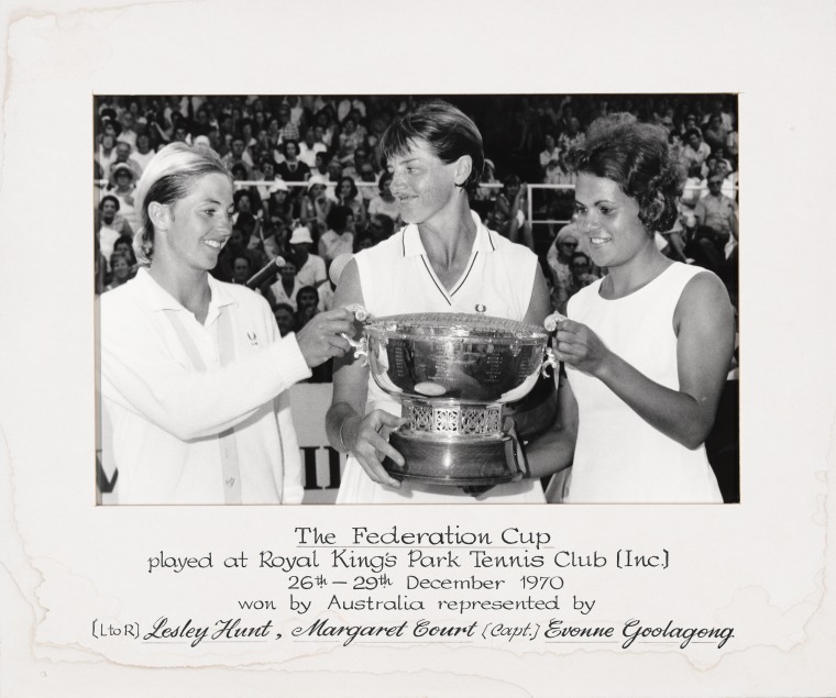 BA2806/10: L-R: Lesley Hunt, Margaret Court and Evonne Goolagong, Australian Federation Cup Team, winners of the 1971 Federation Cup final played at Royal King's Park Tennis Club, 29 December 1970
