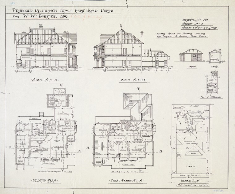 ACC 9592AD/64.1: Proposed residence Kings Park Road, Perth for W.W. Garner esq., drawing no. 101, sheet no.1 [plans and sections], ca. 1907.