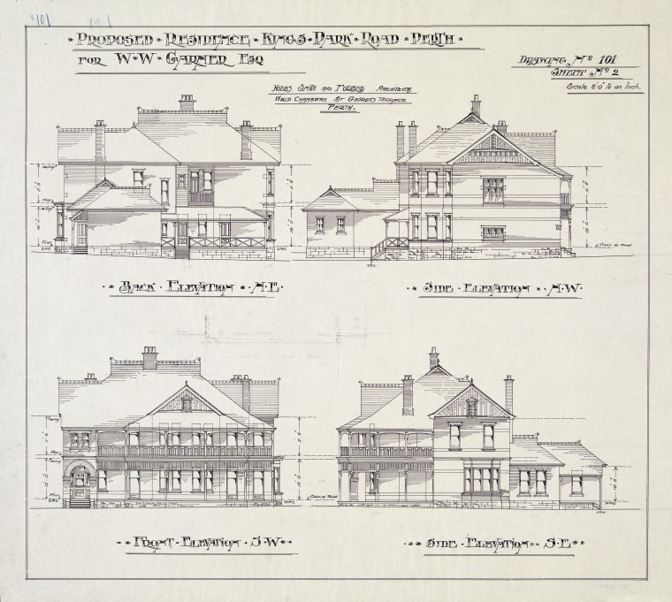 ACC 9592AD/64.2: Proposed residence Kings Park Road, Perth for W.W. Garner esq., drawing no. 101 sheet no.1 [elevations], ca. 1907.