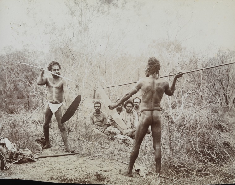 5021B/1/1: Two Aboriginal men posing in mock battle with spears and shields, Carnarvon region, ca. 1906.