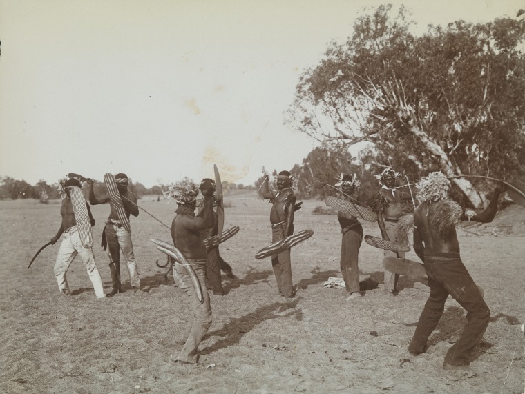 5021B/1/06: Group of Aboriginal men posing in mock battle with spears and shields, Carnarvon region, ca. 1906.