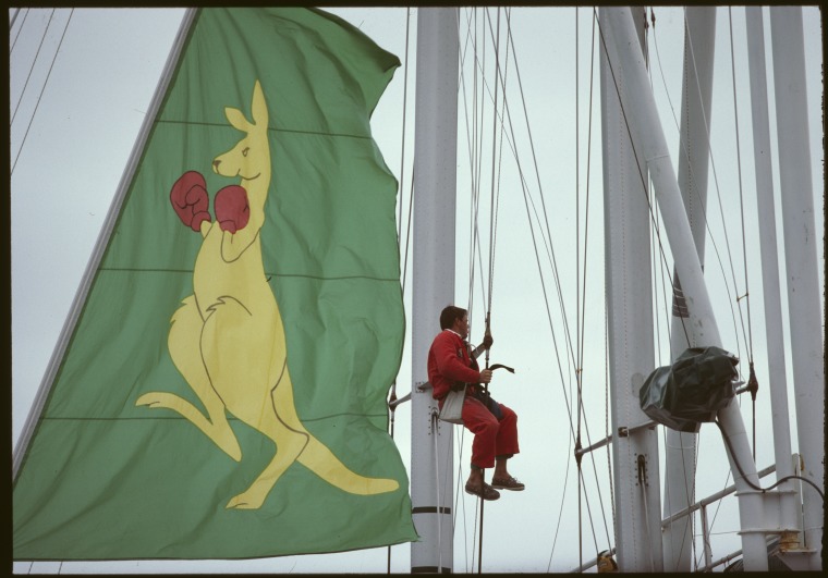 146936PD: A boxing kangaroo flag flyng during the America's Cup, Fremantle, 1987