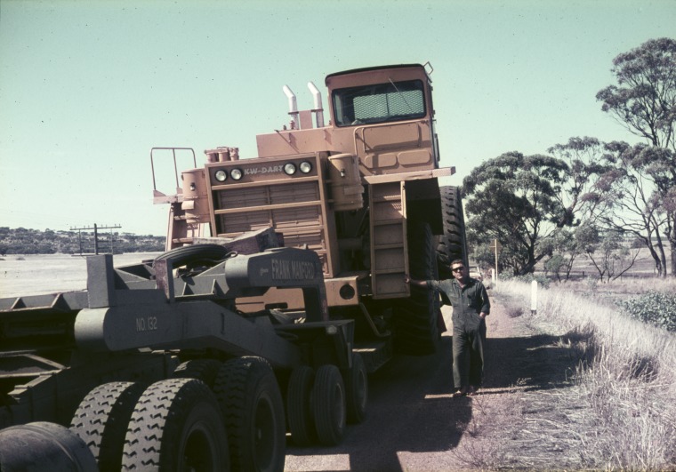 149547PD: KW Dart articulated haul trucks being transported from Dampier to Tom Price, 1966