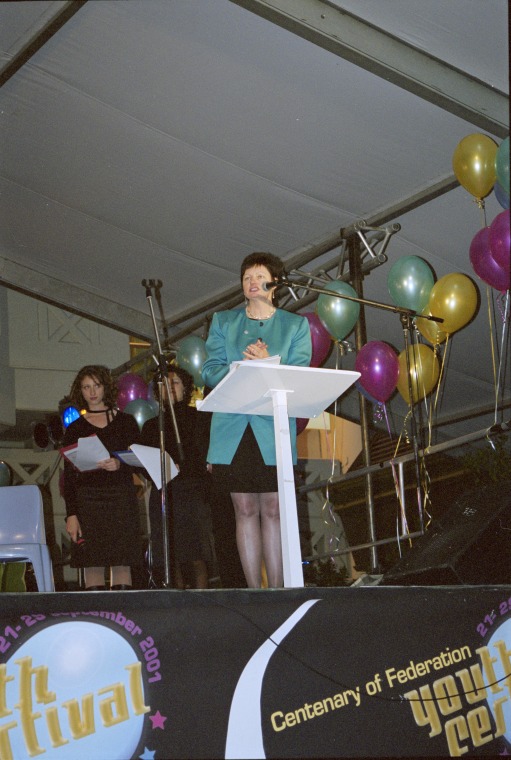 370698PD: Minister for Youth Affairs Sheila McHale speaking at Culture Shock, held at Forrest Place, Perth as part of the Centenary of Federation Youth Festival, September 2001.