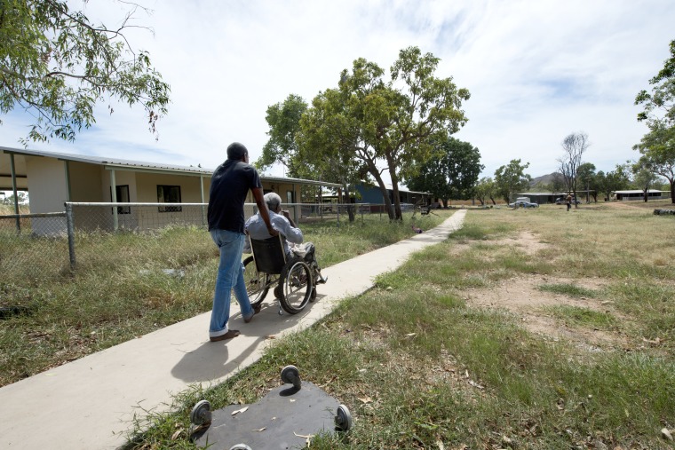 BA2840/23: Clint Ward pushing his farther Ben down to the generator shed at the other end of the Cockatoo Springs community April 26 2017
