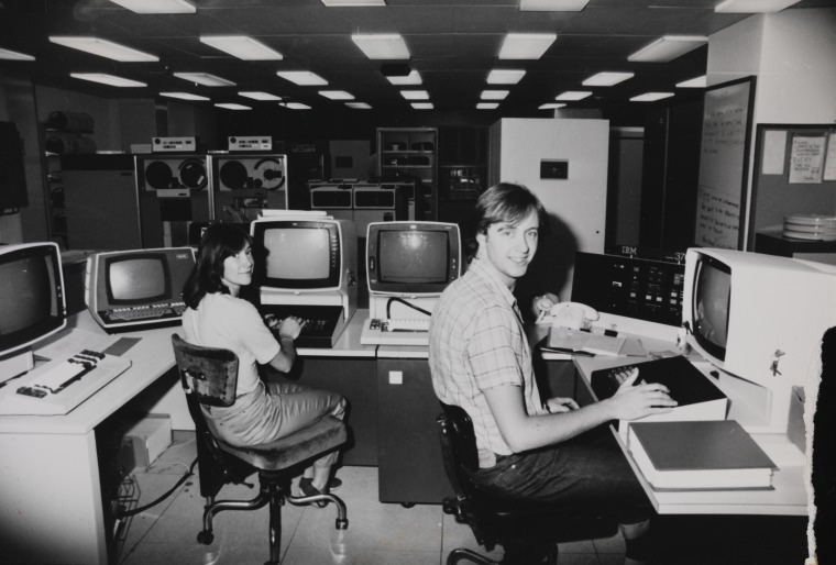 BA2817/924: Computer operators Kathy Kennedy and Colin Disley at the control console in the new computer room at Hamersley House, Perth, 1981