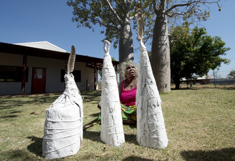 BA2840/140: Agnes Armstrong painting Devil Devil spirit hats using paperbark at the Waringarri Aboriginal Arts Centre, Kununurra, 18 May 2017