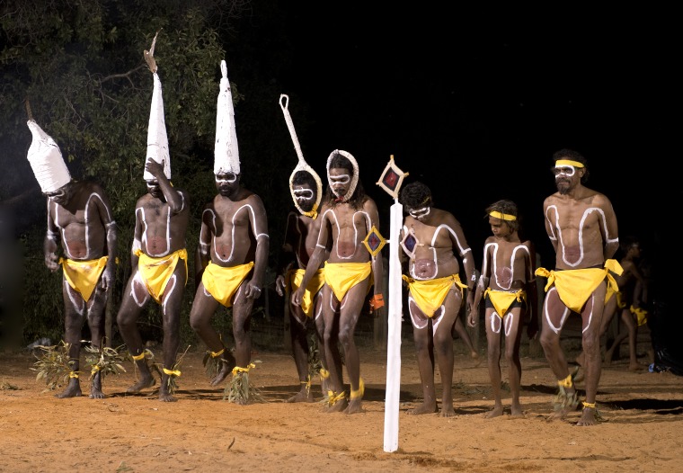BA2840/150: Miriwoong dancers performing the joonba during the community night at the Waringarri Aboriginal Arts Centre, Kununurra, 21 May 2017