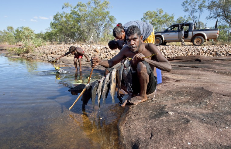 BA2840/227: Maurice Simon displaying a good catch of black bream that he caught at Barlow Waterhole East Kimberley 26 May 2017