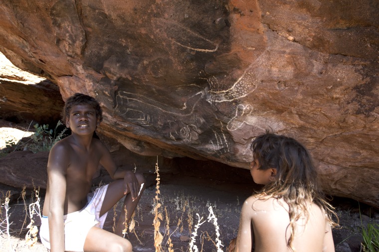 BA2840/238: Garth Simon & Patrick Hall looking at rock art at their grandmothers rock art site Barlow Springs in the East Kimberley 26 May 2017