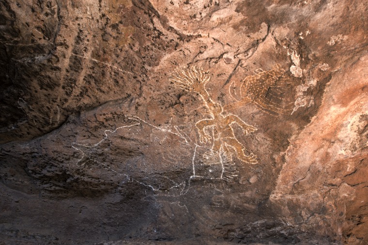 BA2840/239: A big catfish and lightning man artwork on the walls of Jodie Halls mothers rock art site Barlow Springs in the East Kimberley 26 May 2017