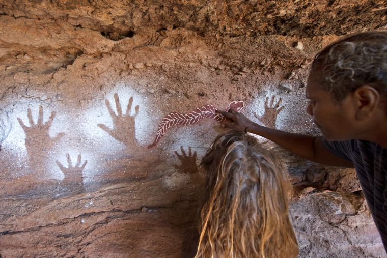BA2840/243: Jodie Hall showing her young son Patrick her mothers dreaming totem of the death adder at the family rock art site at Barlow Springs in the East Kimberley 26 May 2017