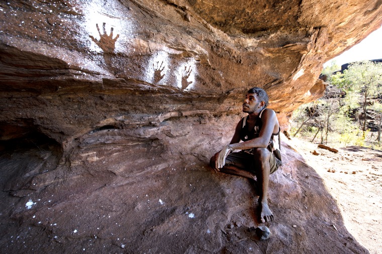 BA2840/245: Maurice Simon moved after having his hand stencil added to the wall along with his elders hand stencils at Barlow Springs 26 May 2017