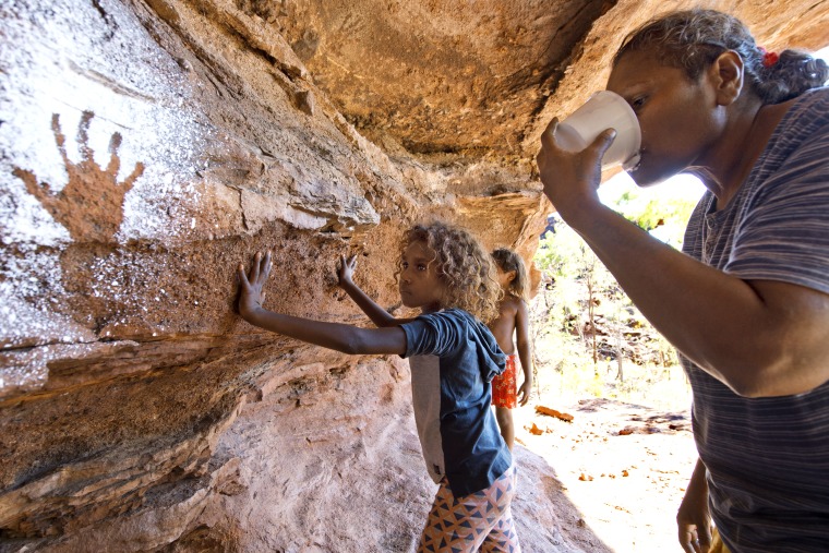 BA2840/246: Grace Hall waiting to have her hand stencil added to the family rock art site wall at Barlow Springs 26 May 2017