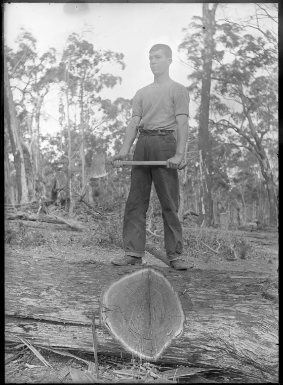 154220PD: Phillip Sydney (Sid) Wilson chopping a log at Lyalls Mill, ca.1906