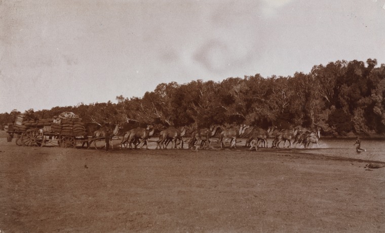 BA2596/1/51: A camel team pulls a wagon across the Fitzroy River, 1921