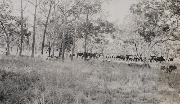 BA2596/1/35: Aboriginal prisoners sit among the trees at the head of the Scaddan River in the Kimberley, June 1922