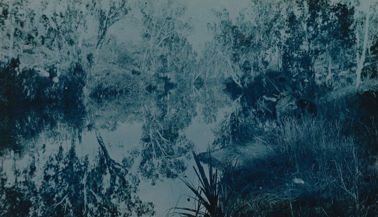 BA2596/1/276: A mounted police officer (at right) looks over the Scaddan River in the Kimberley, June 1922
