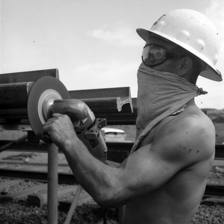 BA2817/2149: Angle grinding rail ends in preparation for butt welding at the 2 Mile Yards near Dampier, 1966