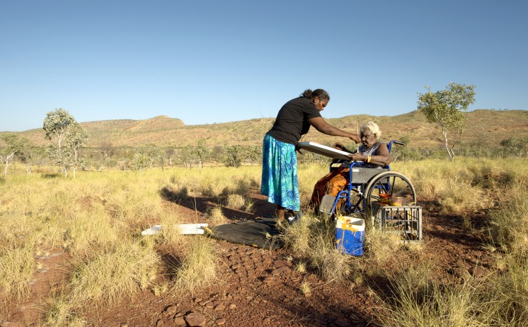 BA2840/267: Jodie Hall helping Lena Nyadbi paint her Barramundi Dreaming on her country at Mt Evelyn, 19 August 2017