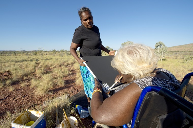 BA2840/269: Jodie Hall helping Lena Nyadbi paint her Barramundi Dreaming on her country at Mt Evelyn, 19 August 2017