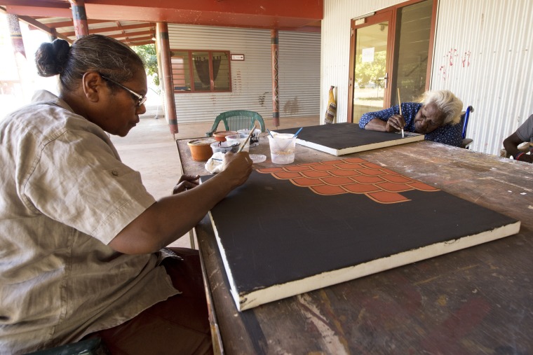 BA2840/271: Jodie Hall and Lena Nyadbi painting their Barramundi Dreaming at the Waringarri Aboriginal Arts Centre, Kununurra, 5 September 2017
