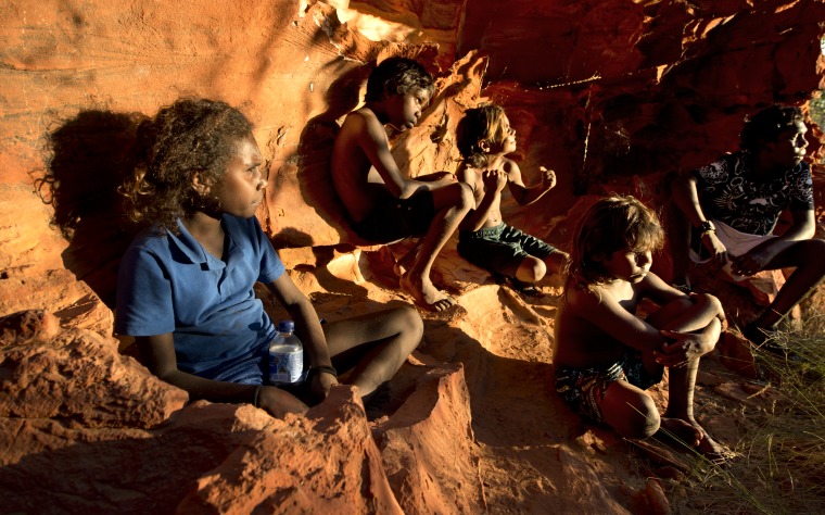 BA2840/359: Grace Hall (foreground) with the boys in Hidden Valley, Kununurra, 1 August 2017
