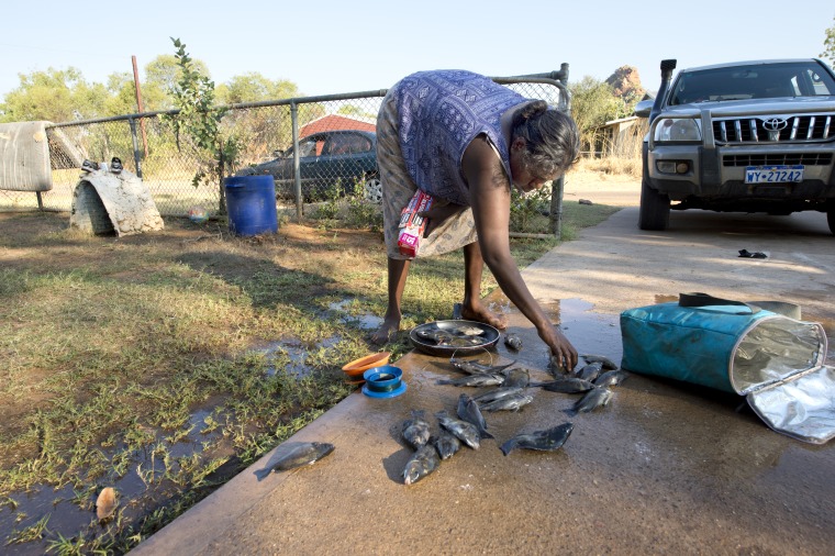 BA2840/374: Bernadette Meeway sorting out black bream fish for tea at her mother Jodie Hall's home in Mirima, Kununurra, 3 September 2017