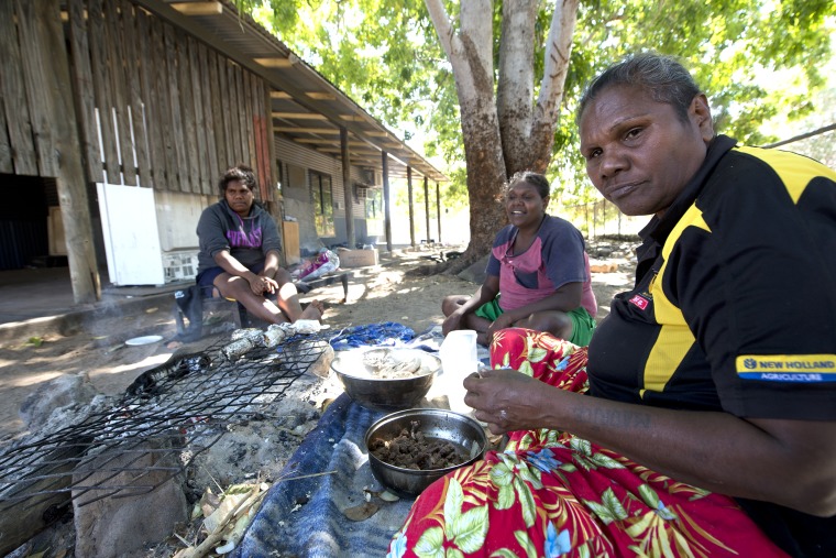 BA2840/375: Jodie hall and daughters Bernadette Meeway and Desiree Simon cooking damper and kangaroo for breakfast, Mirima, Kununurra, 6 August 2017